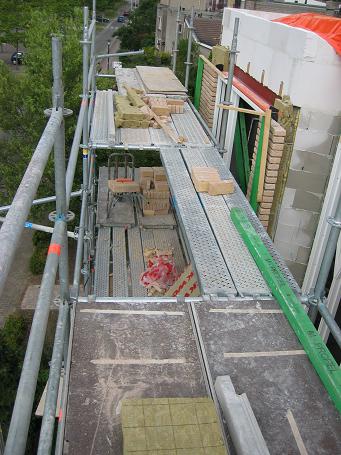 's Middags hebben ze zo veel mogelijk al het grote materieel uit de opbouw gehaald. Het laatste raamkozijn, waarvan de ruimte nu nog werd gebruikt als doorgeefluik, moest worden geplaatst, zodat volgende week ook daaromheen kan worden gemetseld.
